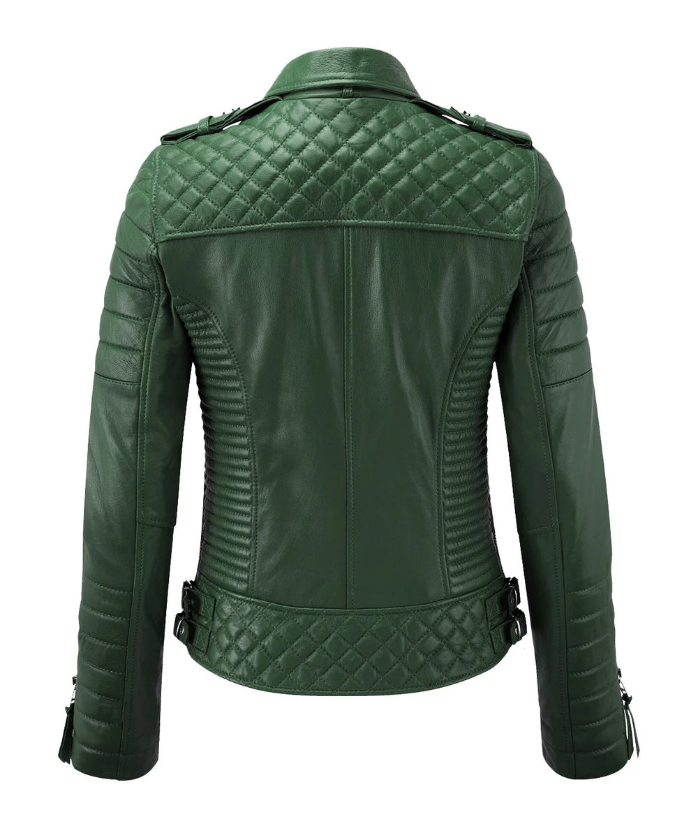 Inspired by classic biker fashion, this women’s leather biker jacket features a sleek slim-fit design that provides a sharp and modern silhouette. The combination of rugged aesthetics and refined craftsmanship makes it a versatile choice for both casual and smart-casual wear.