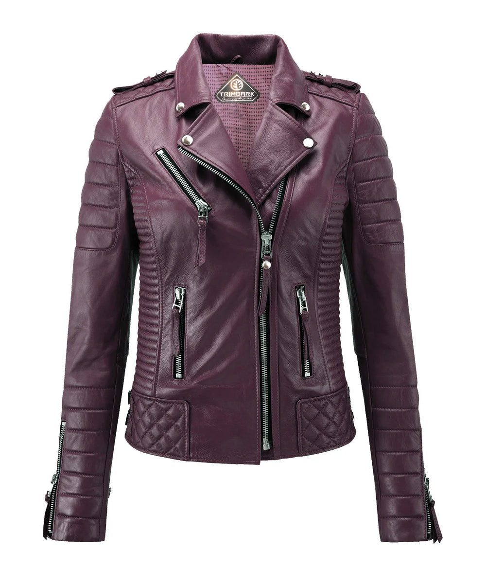Inspired by classic biker fashion, this women’s leather biker jacket features a sleek slim-fit design that provides a sharp and modern silhouette. The combination of rugged aesthetics and refined craftsmanship makes it a versatile choice for both casual and smart-casual wear.
