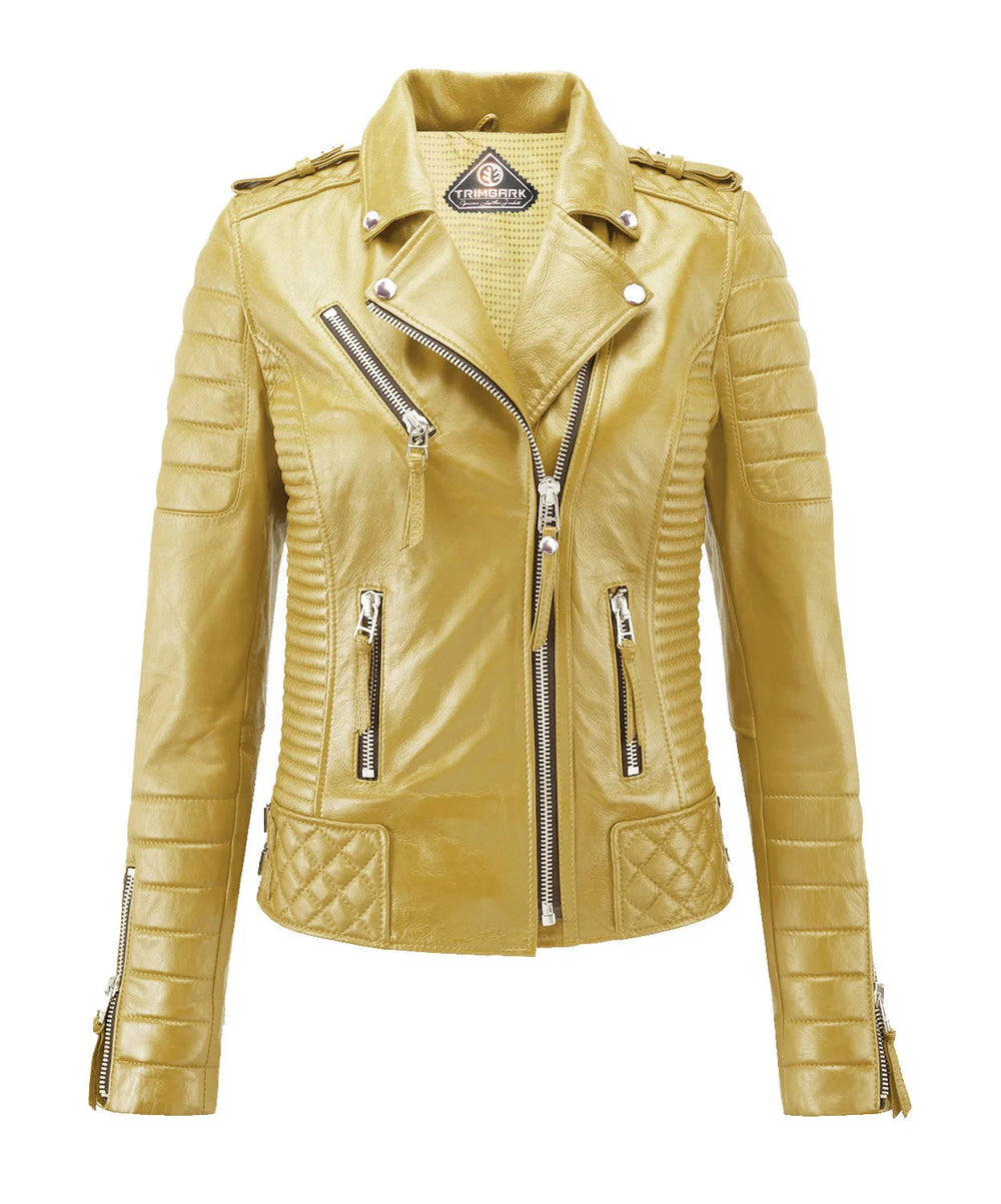 Inspired by classic biker fashion, this women’s leather biker jacket features a sleek slim-fit design that provides a sharp and modern silhouette. The combination of rugged aesthetics and refined craftsmanship makes it a versatile choice for both casual and smart-casual wear.